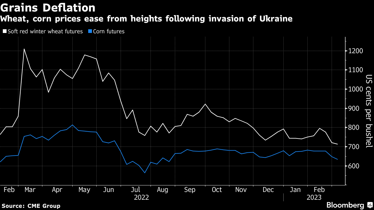 With grain prices slumping from the highs that followed Russia’s February 2022 invasion of Ukraine, there’s now the prospect of food deflation, including for meat, cereal and bread.