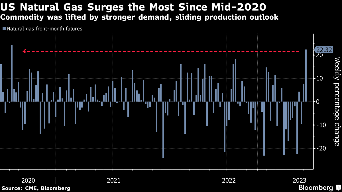 US natural gas prices are rebounding after last month hitting the lowest since pandemic-era lockdowns more than two years ago. They’re up about 50% since Feb. 22. The biggest reason for the surge: a cold blast that’s forecast to boost heating demand as production appears to be slowing. Prices are also being lifted by a record amount of natural gas heading to US export terminals after a key facility in Texas restarted.