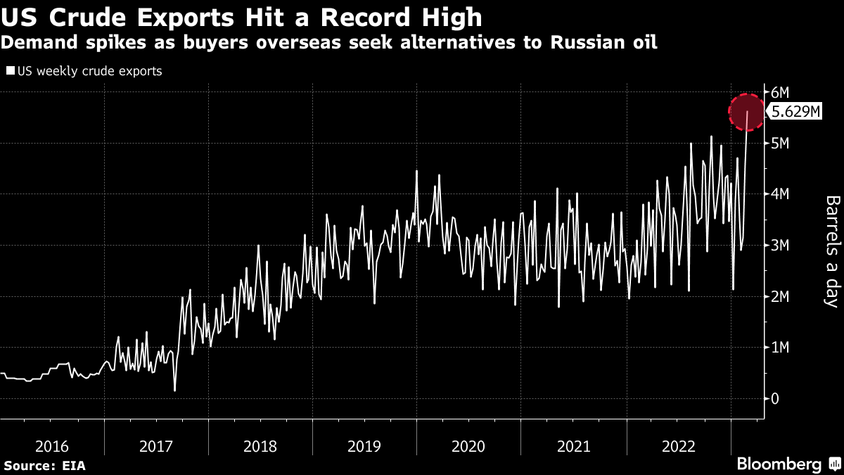 The US has become an increasingly critical supplier to buyers overseas. Among the reasons: buyers in Asia and Europe are still seeking alternatives to sanctioned Russian oil and the US benchmark West Texas Intermediate crude is trading at a steep discount to its international counterpart.