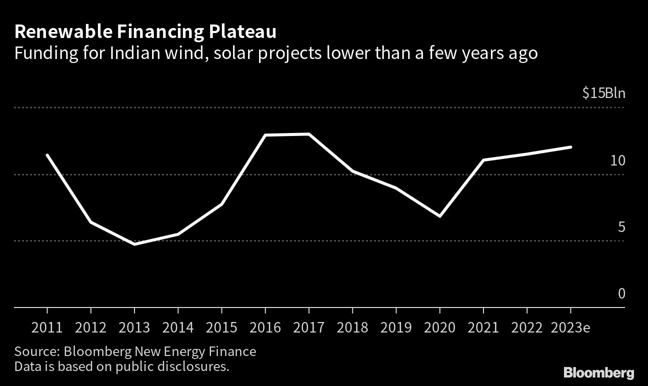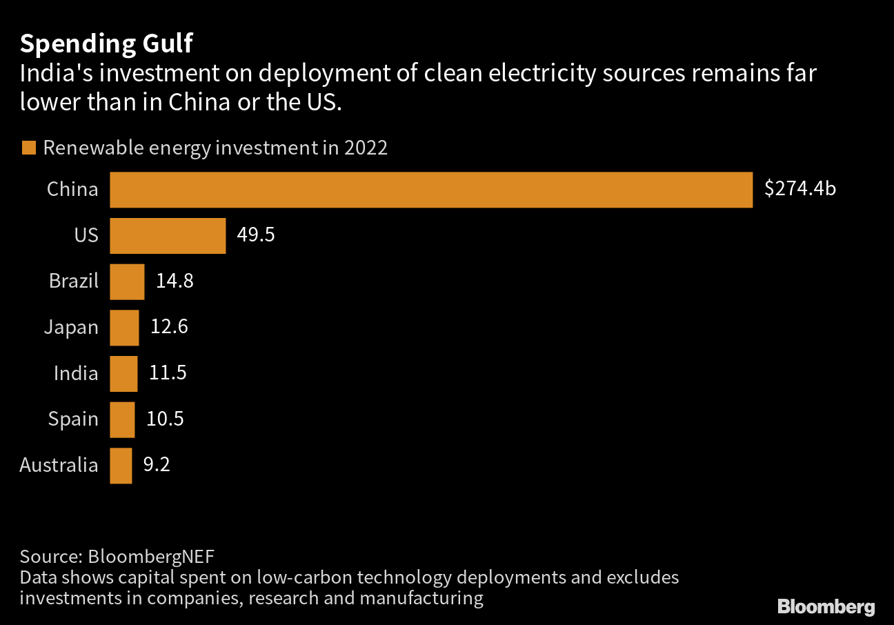 Investment in the deployment of renewable energy technology rose about 4% to $11.5 billion in India last year, but that’s still lower than a recent peak of $12.7 billion in 2017, according to data compiled by BloombergNEF. It’s also a fraction of the $274 billion total in China and $49.5 billion spent in the US.