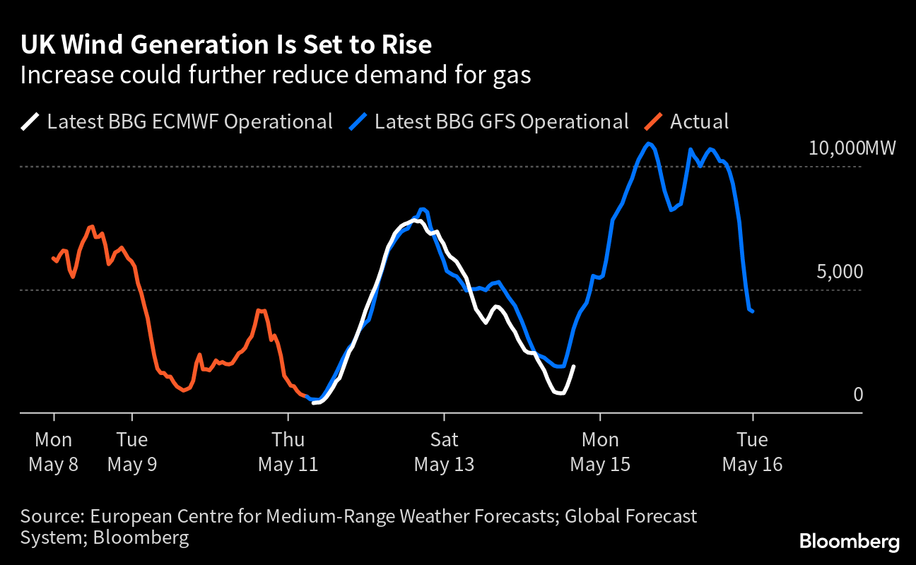 That’s already resulted in some gains in the UK’s day-ahead gas prices earlier this week, although models point to a rebound in wind output in the UK from Friday. The growing fleet of wind farms in the country — as well as in continental Europe — has helped to cut gas consumption.