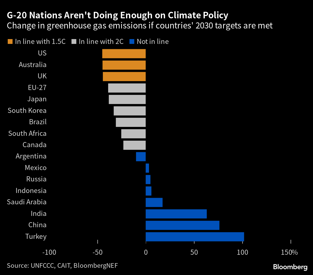 The report is the latest sign that a widely-anticipated backslide on the climate hasn’t materialized even though countries risk relying more on dirtier fuels like coal to shield citizens from rising prices. Yet stronger policies will still have to be put in place if the world is to keep global warming below the Paris Agreement target of 1.5 degrees. G-20 nations account for around 80% of global greenhouse gas emissions.