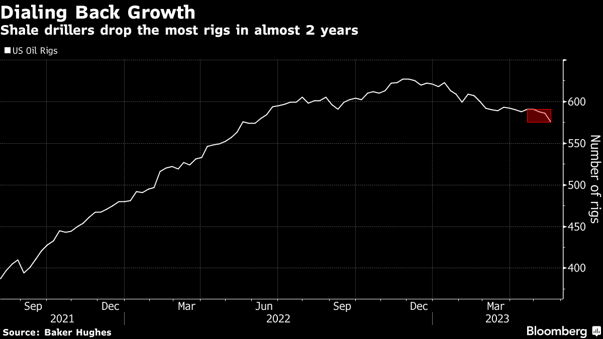 Rigs targeting crude declined by 11 to 575 this week, according to data released Friday by Baker Hughes Co. It’s the biggest weekly drop since September 2021. The pullback was led by the Permian Basin of West Texas and New Mexico, the most prolific US shale play, where four rigs were dropped.