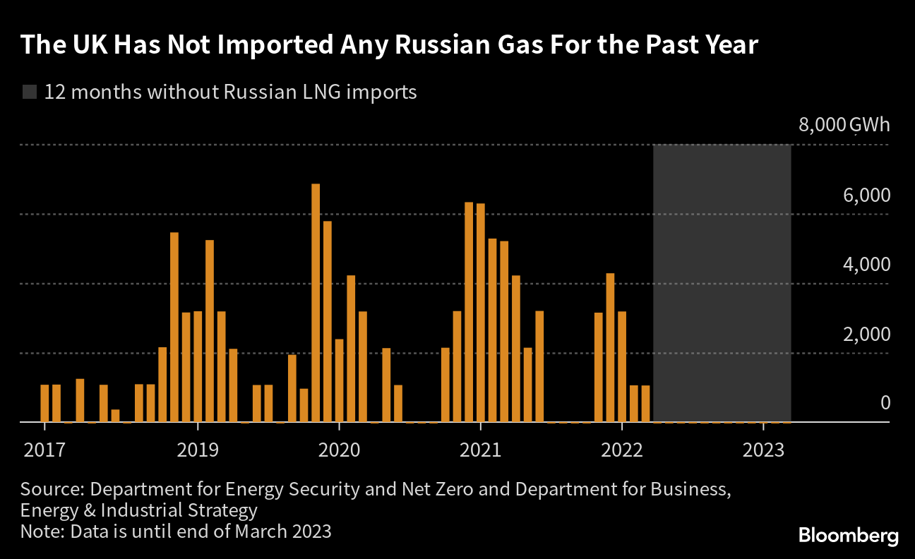 (Bloomberg) -- Britain imported no natural gas from Russia in the past 12 months, a sharp contrast with other European countries that are still reliant on the fuel helping fund Moscow’s Ukraine war.