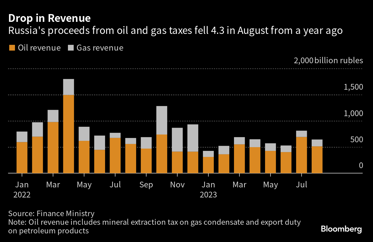 Gas revenue rose 14.5% in August from a year ago, to 130.9 billion rubles. The boost came from the gas-extraction tax, which reached 91.1 billion rubles amid a temporary increase in the duty paid by Gazprom PJSC of 50 billion rubles per month from 2023 to 2025.