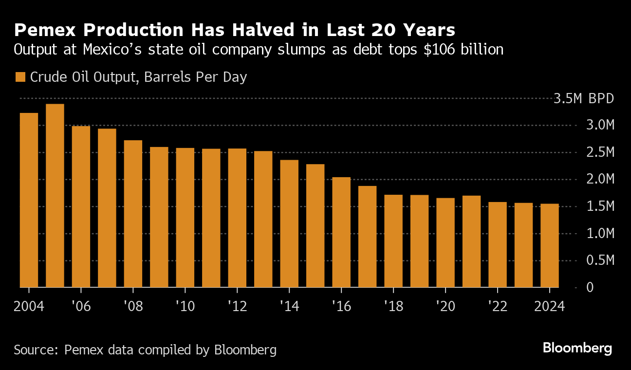 Pemex’s oil and gas output has also withered to less than half of what it was two decades ago. Slashing debt is key to turning around the company’s finances, since money that could be spent fixing aging equipment is instead being used to cover unpaid bills and interest payments.