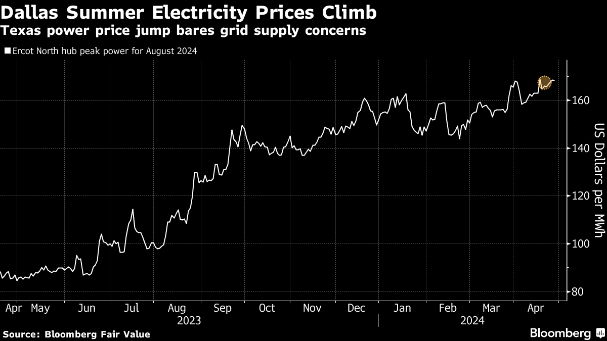 Already in mid-April, August power prices for Dallas soared to $168.70 a megawatt-hour, which was the highest level in five years for this time of the year, according to Bloomberg Fair value data. Prices were still hovering around that level on Friday, an 82% premium versus a year earlier.