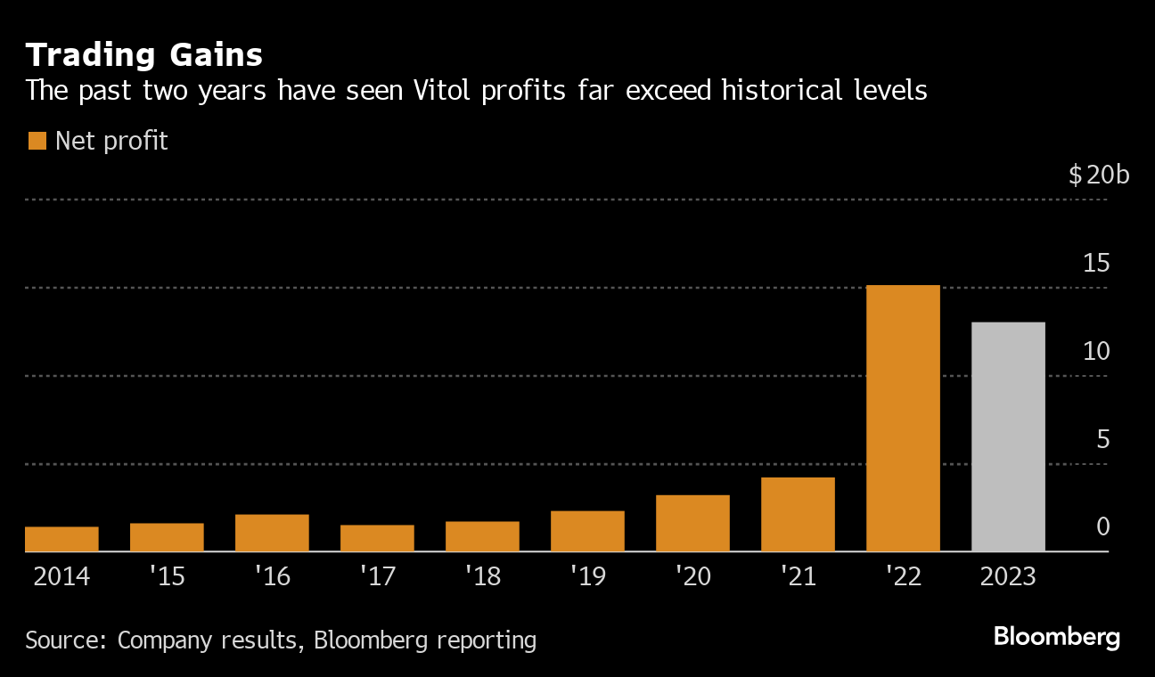 (Bloomberg) -- Vitol Group posted a profit of about $13 billion for 2023, according to a person familiar with the matter, marking the second consecutive year of bumper earnings for the world’s biggest independent oil trader.