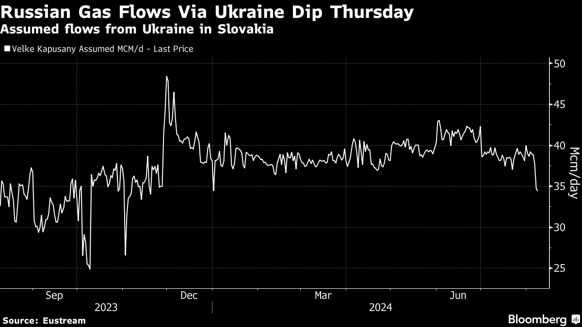 The Sudzha station near the border is part of Russia’s last remaining pipeline route to Europe via Ukraine. Gas flows at the transit point are continuing for now with volumes set to remain in line with previous weeks on Friday.