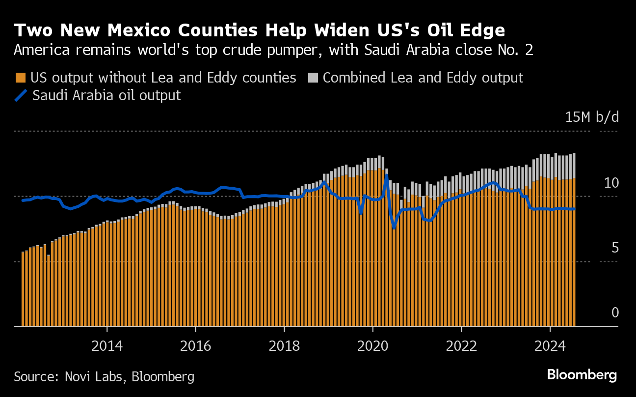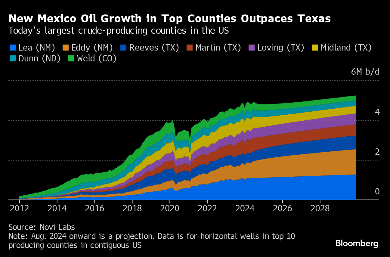 After pumping less crude in the years leading up to the pandemic than top counties in neighboring Texas, New Mexico’s Lea County has been rapidly gaining ground. Output there has expanded faster than in any other US county, last year becoming the first to ever produce more than 1 million barrels per day, according to energy research firm Enverus. Neighboring Eddy County will hit the million-barrel-a-day milestone by September next year, predicts energy analytics firm Novi Labs.