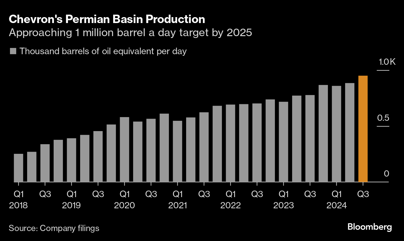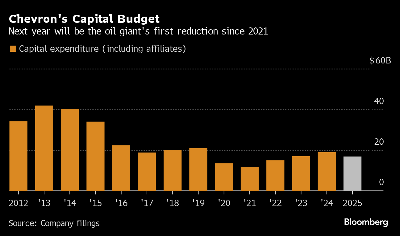 Chevron will reduce capital expenditures in the Permian Basin to between $4.5 billion and $5 billion in 2025, a drop of as much as 10%, the company said in a statement Thursday. Globally, the oil explorer expects to spend about $17 billion compared to $19 billion this year in the first budget cut since 2021.