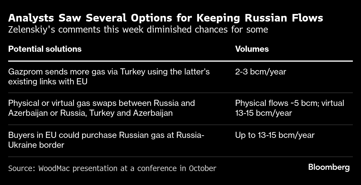 The current deal governing pipeline flows won’t be renewed, and Ukraine tempered hopes this week for many of the other potential workarounds that had been floated by central European countries which still rely on the fuel. President Volodymyr Zelenskiy doesn’t want any gas of Russian origin to transit his country unless Moscow isn’t paid until the war ends, leading to frictions in last-minute discussions and market volatility as traders try to guess the implications.