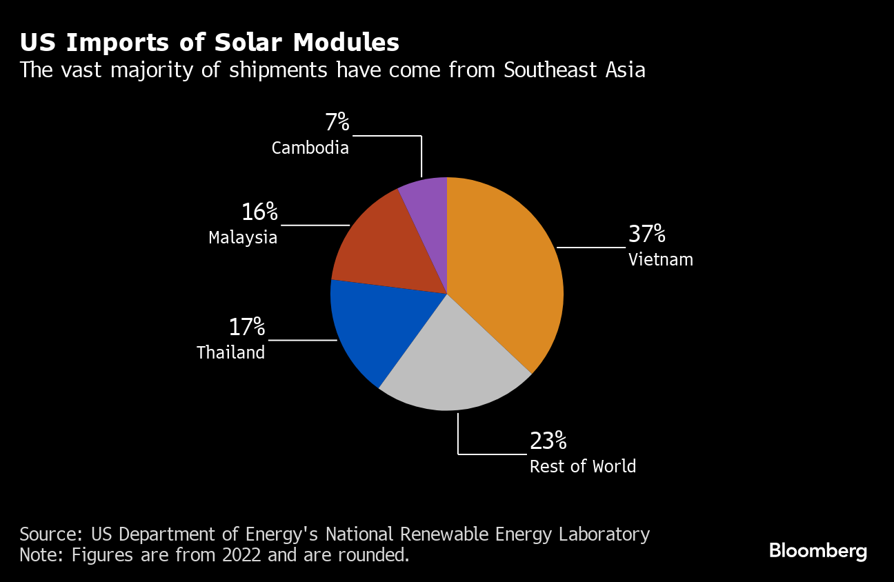 When Biden ordered the tariff moratorium in 2022, the threat of new duties had prompted some companies to halt shipments, delaying some US solar projects and suspending work on others. Biden’s move singlehandedly revived panel imports from Southeast Asia, sending them surging to record levels last year.