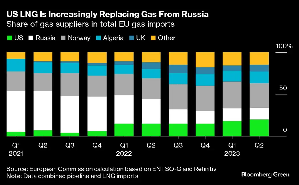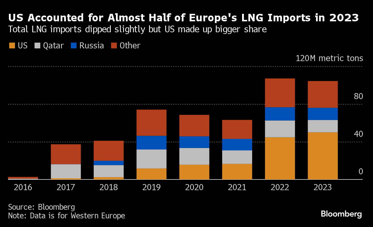 (Bloomberg) -- Europe, long-reliant on Russian natural gas, has nearly severed its dependency on the Kremlin in less than two years. Its preferred replacement — gas from the US — is widely viewed as abundant, politically palatable and less likely to be choked off than pipelines from Siberia.