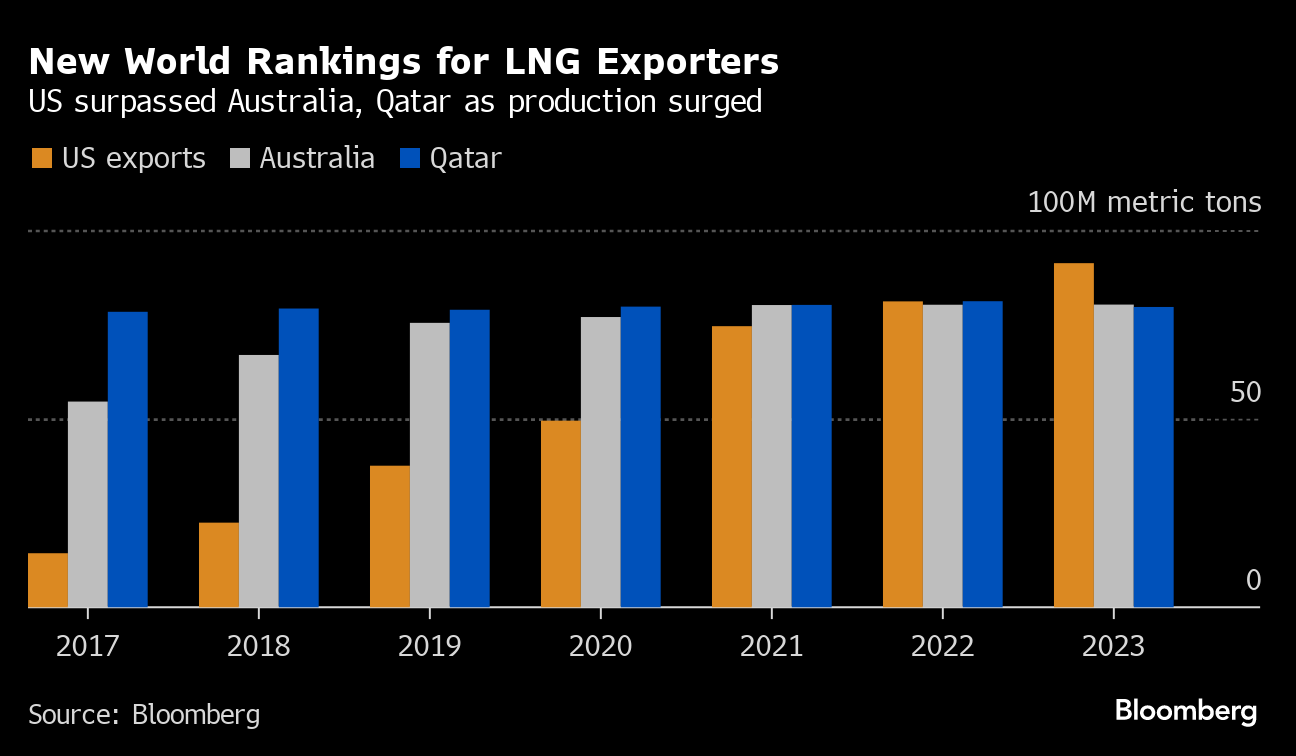 (Bloomberg) -- The US has become the world’s biggest exporter of liquefied natural gas for the first time, with 2023 shipments overtaking leading suppliers Australia and Qatar.