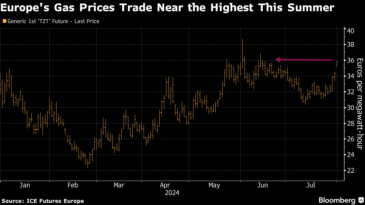 LNG flows to Europe have been about 30% lower than average in July, ship-tracking data show. Meanwhile, outages at Norwegian fields have further tightened the market. While the continent’s storage facilities are well-stocked for the time of year, hot weather is pushing up demand for air-conditioning.
