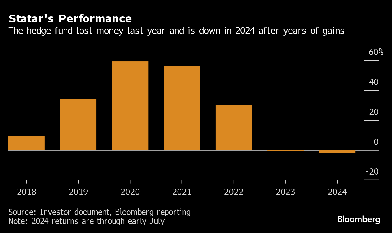 His Miami-based Statar Capital is down about 2% this year thanks to a recovery in July, after having dropped about 13% in the three months through June, according to people with knowledge of the matter. The fund Was up 5% in the first quarter and managed $2.9 billion at the end of March, according to an investor letter.