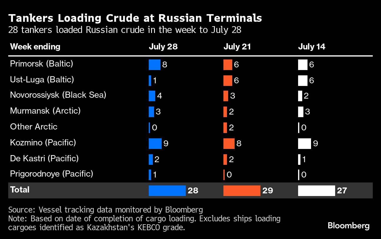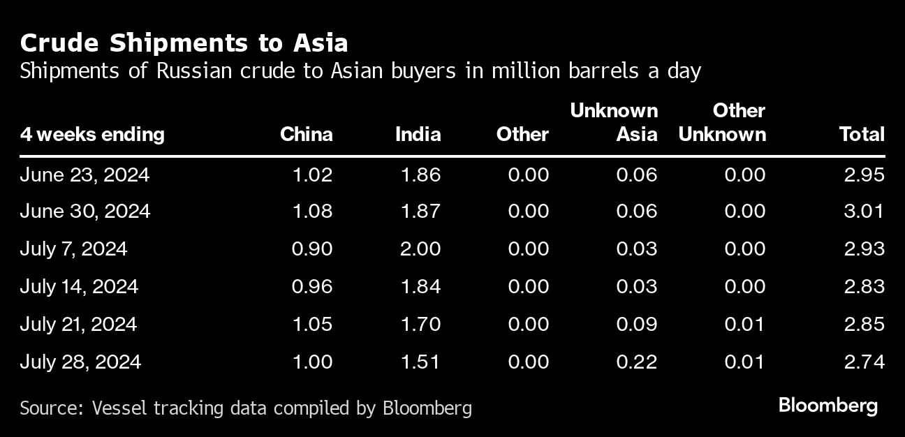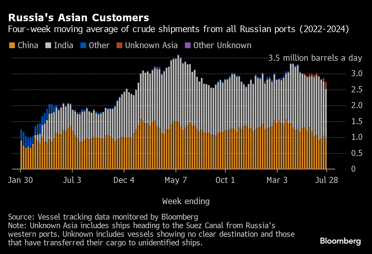 Observed shipments to Russia’s Asian customers, including those showing no final destination, fell to a seven-month low of 2.74 million barrels a day in the four weeks to July 28.