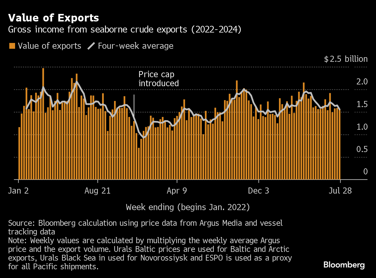 This story forms part of a weekly series tracking shipments of crude from Russian export terminals and the gross value of those flows. The next update will be on Wednesday, Aug. 14.