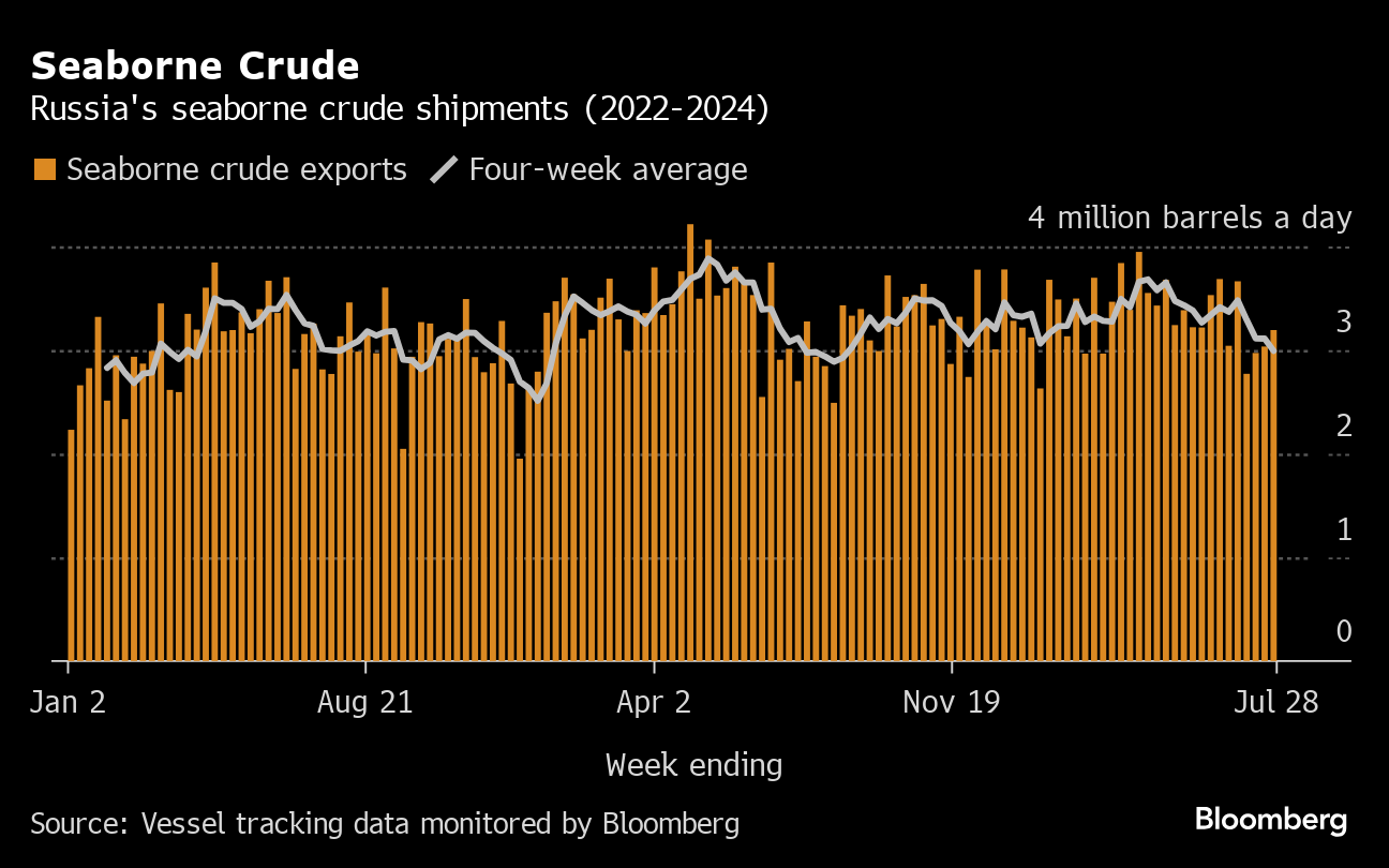 It means Russia’s seaborne daily crude flows in the week to July 28 rose by about 75,000 barrels to 3.11 million, their third straight increase. But it wasn’t enough to reverse the continuing fall in the less volatile four-week average, which dropped by another 140,000 barrels a day to 2.97 million, its lowest since August 2023.