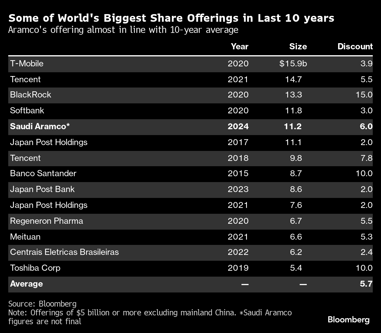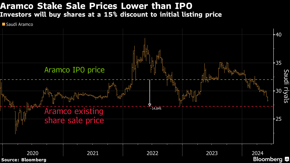 The government will sell almost 1.55 billion shares for 27.25 riyals ($7.27) apiece, according to a statement. That’s a 6% discount to the stock’s last close before the deal was announced, in line with the average for offers of a similar size over the past decade.