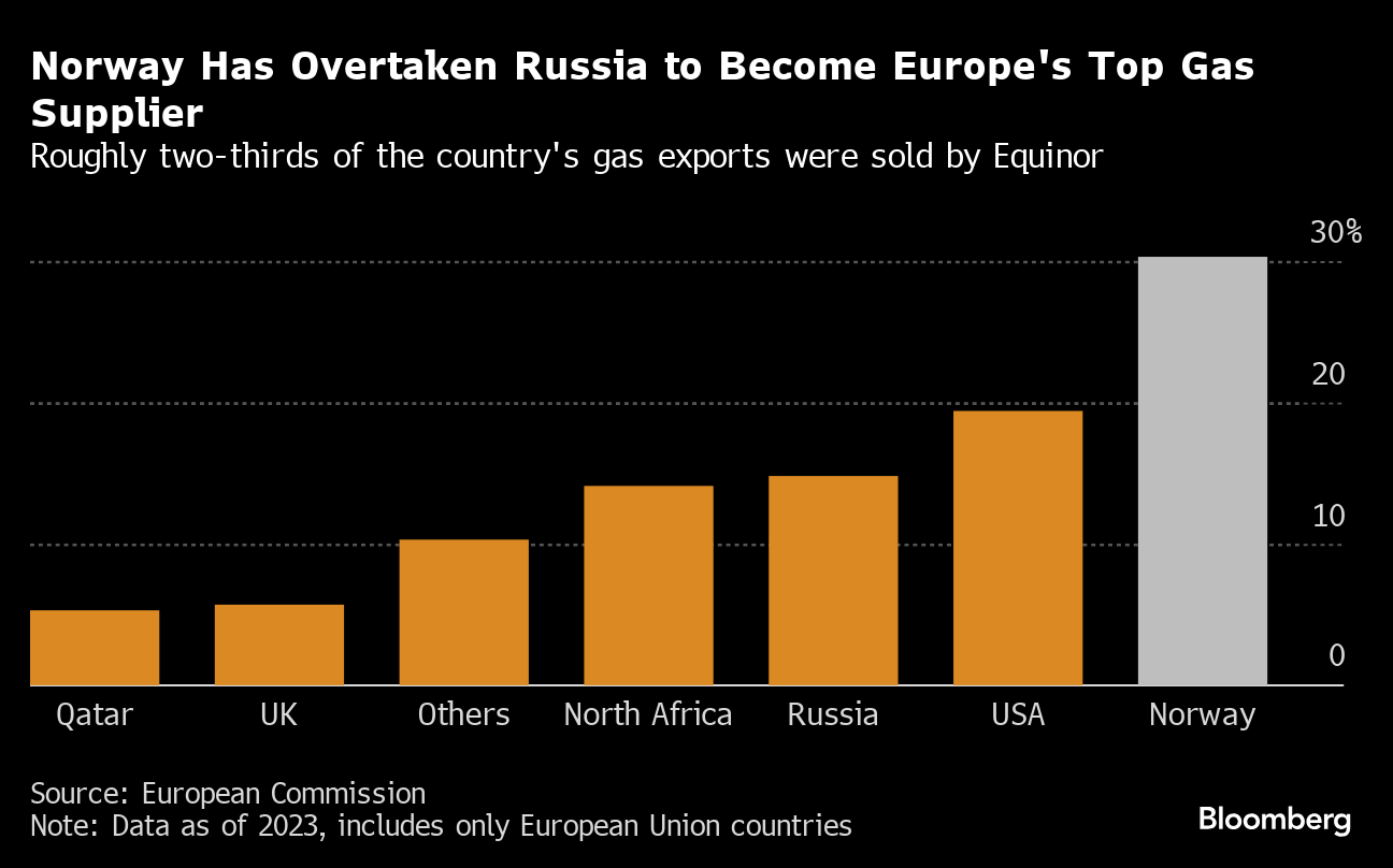 In the more than two years since Russia invaded Ukraine, sending energy prices soaring, the Norwegian oil and gas giant has quietly picked up the crown that once belonged to Russia’s Gazprom PJSC. Norway now supplies 30% of the bloc’s gas; Gazprom provided about 35% of all Europe’s gas before the war. And of the more than 109 billion cubic meters of natural gas Norway exported to Europe last year — enough to power Germany until 2026 — roughly two-thirds was marketed and sold by Equinor.