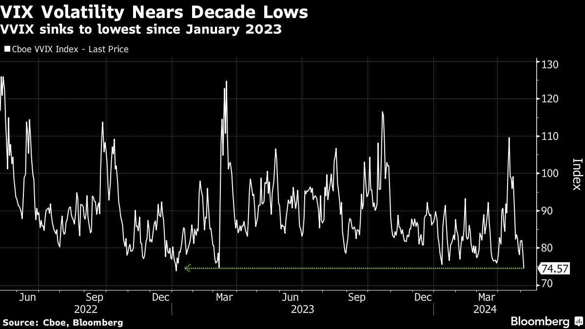 - Not only is S&P volatility sinking, with the VIX dropping back into its 1st-quarter range, but the VVIX — the vol of vol — is even cheaper. It closed at the lowest level since January 2023, and is near decade-lows.