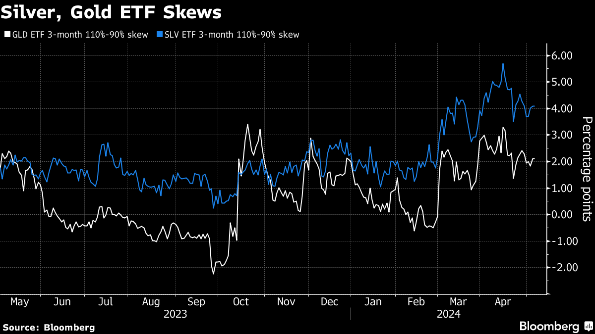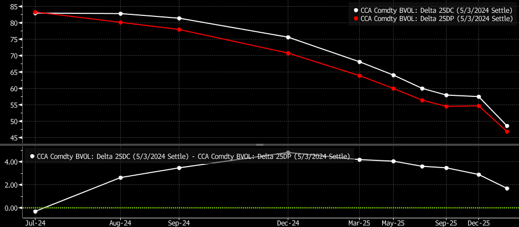Cocoa’s wild ride is showing no signs of an end, keeping options volatility elevated even as prices have taken a breather from the massive leaps higher. Still, the levels appear justified by the realized volatility, with huge swings whipsawing traders. Skew is a more nuanced story, with some short-term bearishness — or at least cover against a drop in prices — coming into the market.