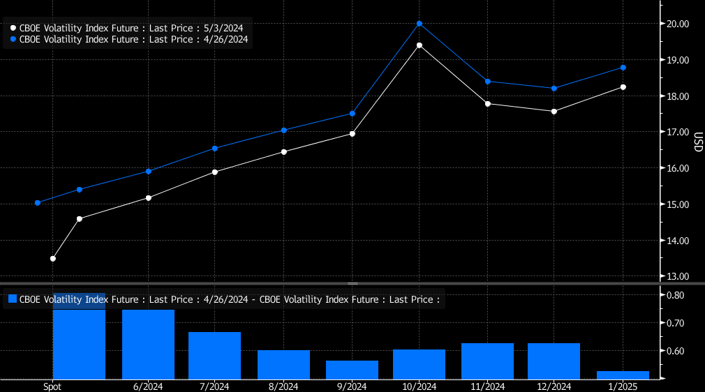 - While spot VIX got hammered last week, the rest of the curve weakened much more gently. Still, it looks like fears of a summer selloff appear muted.