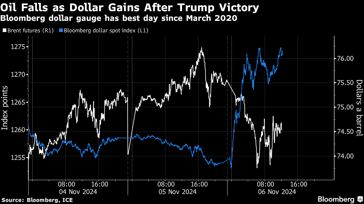 With Trump clinching back the White House, a gauge of the dollar posted its biggest gain against major currencies since 2020, making raw materials priced in the greenback more costly for many buyers. The likelihood of trade disputes with China is particularly concerning for agricultural markets.