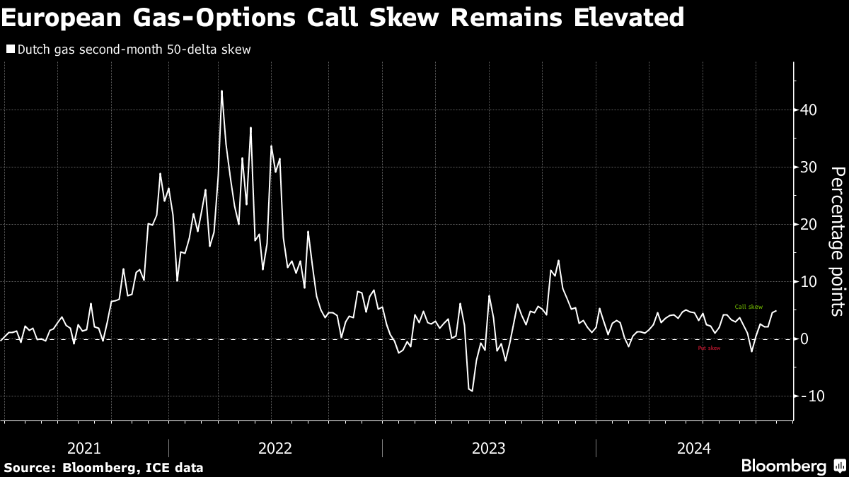 (Bloomberg) -- Natural gas options are signaling European traders still see upside risk for prices, even after concerns linked to the Middle East have receded.