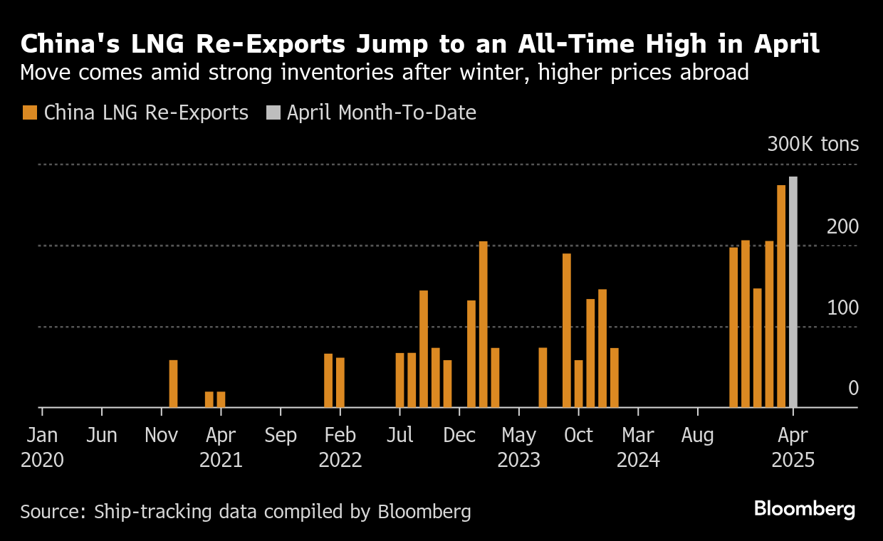 (Bloomberg) -- China has re-exported more than 280,000 tons of liquefied natural gas so far in April, the highest volume ever in a single month, according to ship-tracking data compiled by Bloomberg.