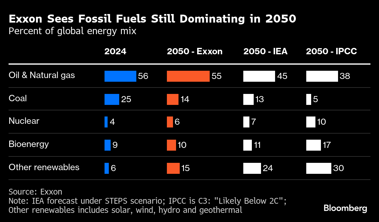 The biggest change from last year’s Energy Outlook was coal consumption, which rose to a record 8.8 billion tons in 2024, according to the IEA. Despite many countries committing to phase out coal, Exxon sees the most polluting fossil fuel making 14% of the global energy mix by 2050, in part due to its ability to provide power when the wind isn’t blowing and the sun isn’t shining.