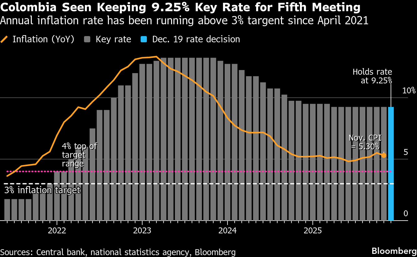 Colombia’s central bank is expected to hold the policy rate at 9.25% for a fifth straight meeting on Dec. 19, with another split decision likely as some board members continue to argue for a cut. Forward guidance may turn more cautious, underscoring a widening divide within the board as several policymakers grow increasingly vocal about inflation risks that could ultimately warrant rate hikes.
