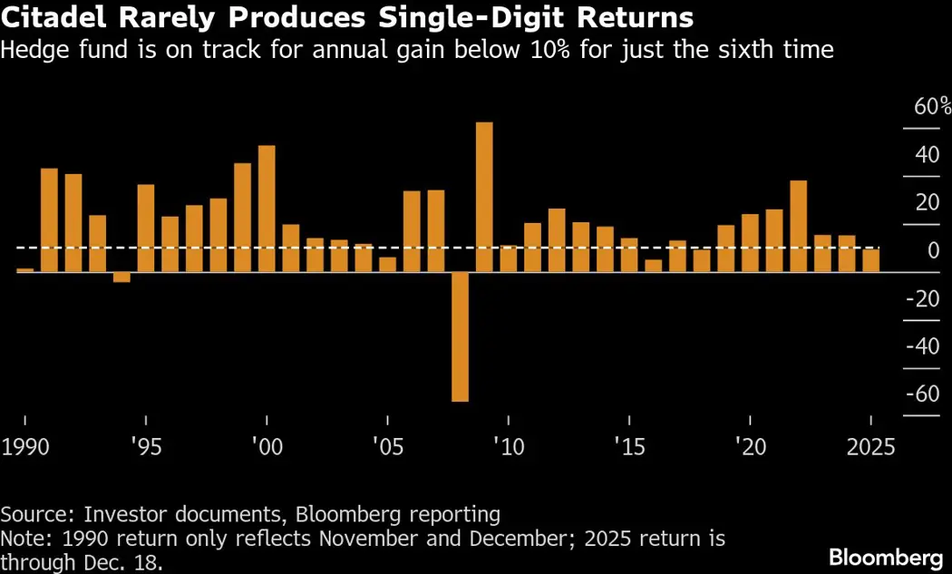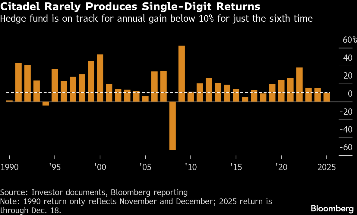 Still, a 9.3% gain would be the firm’s 17th straight year of positive returns, a track record that has allowed Citadel to amass billions more from investors and attract some of the industry’s top talent.
