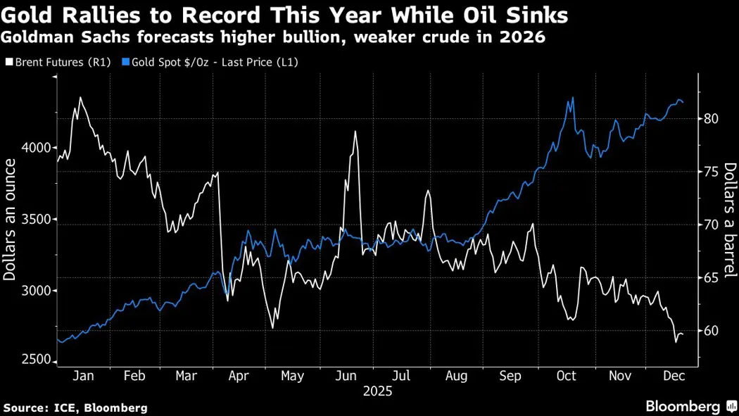 (Bloomberg) -- Gold’s record-setting rally and persistent weakness in crude have been two of the standout features of global commodities this year. Goldman Sachs Group Inc. reckons both those trends will extend into 2026.