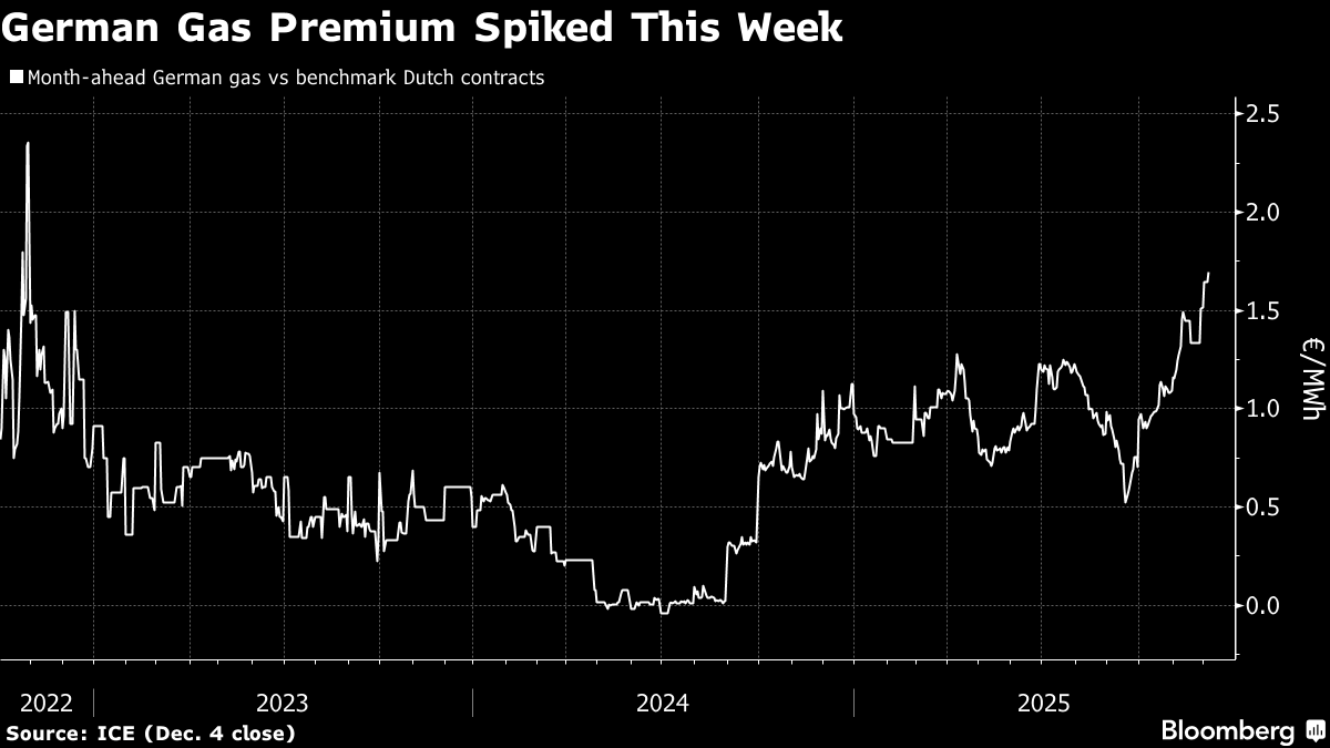 Milder weather forecasts and stable supply pushed all European gas contracts lower this week. But regional futures tend to move more in line with fundamentals, while price swings in the Amsterdam-traded European benchmark are often amplified by speculative activity. The resulting price gap shows traders aren’t convinced yet that Germany is in the clear, even as they’ve grown more relaxed about Europe’s ability to get through winter.
