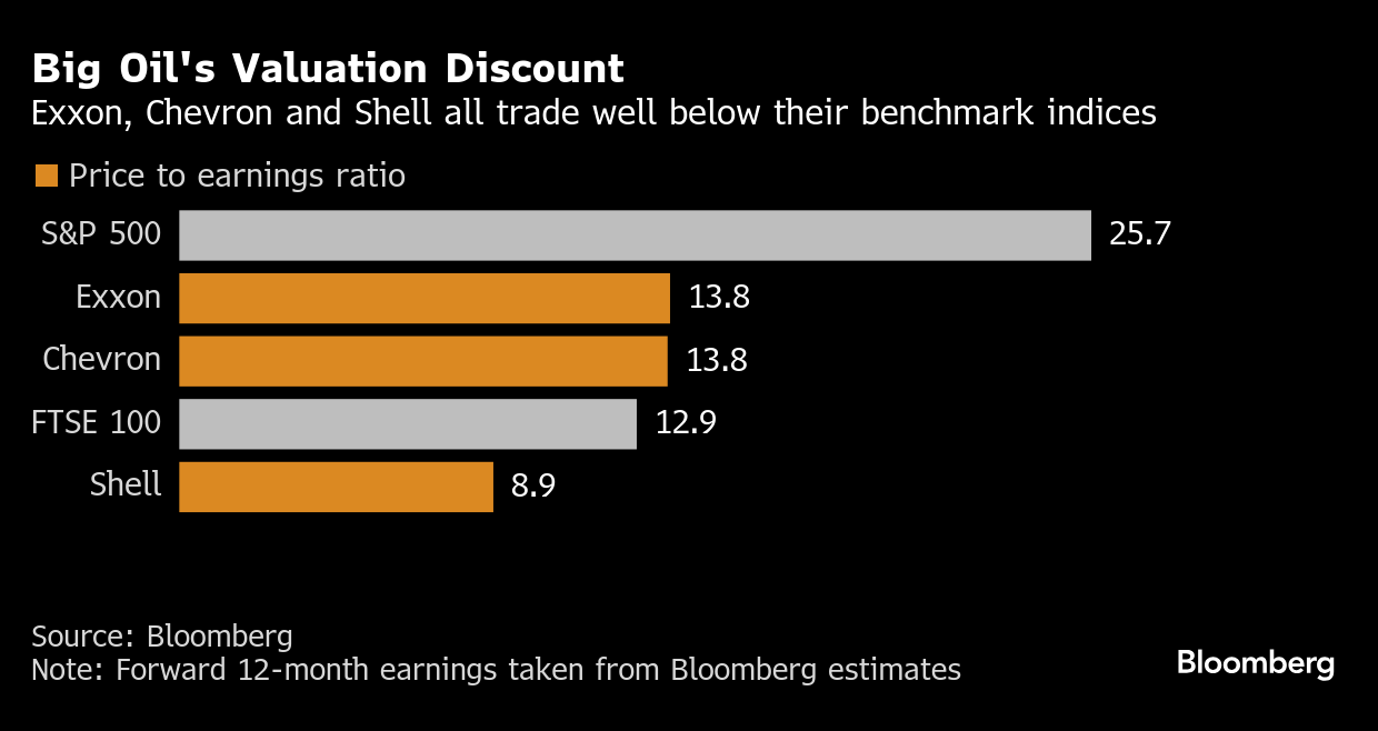 Part of Big Oil’s discounted valuation is due to to its addiction to capital spending, especially the over-budget megaprojects that swallowed up billions of dollars in the 2010s and dragged down equity returns for years later. Another part is investor concern over the sustainability of dividends and buybacks due to the energy transition, despite the expectation oil consumption will reach record levels this year and next. Volatility of commodity-price swings is another consistent drawback for fossil fuels compared with the cash-flow behemoths of Big Tech.