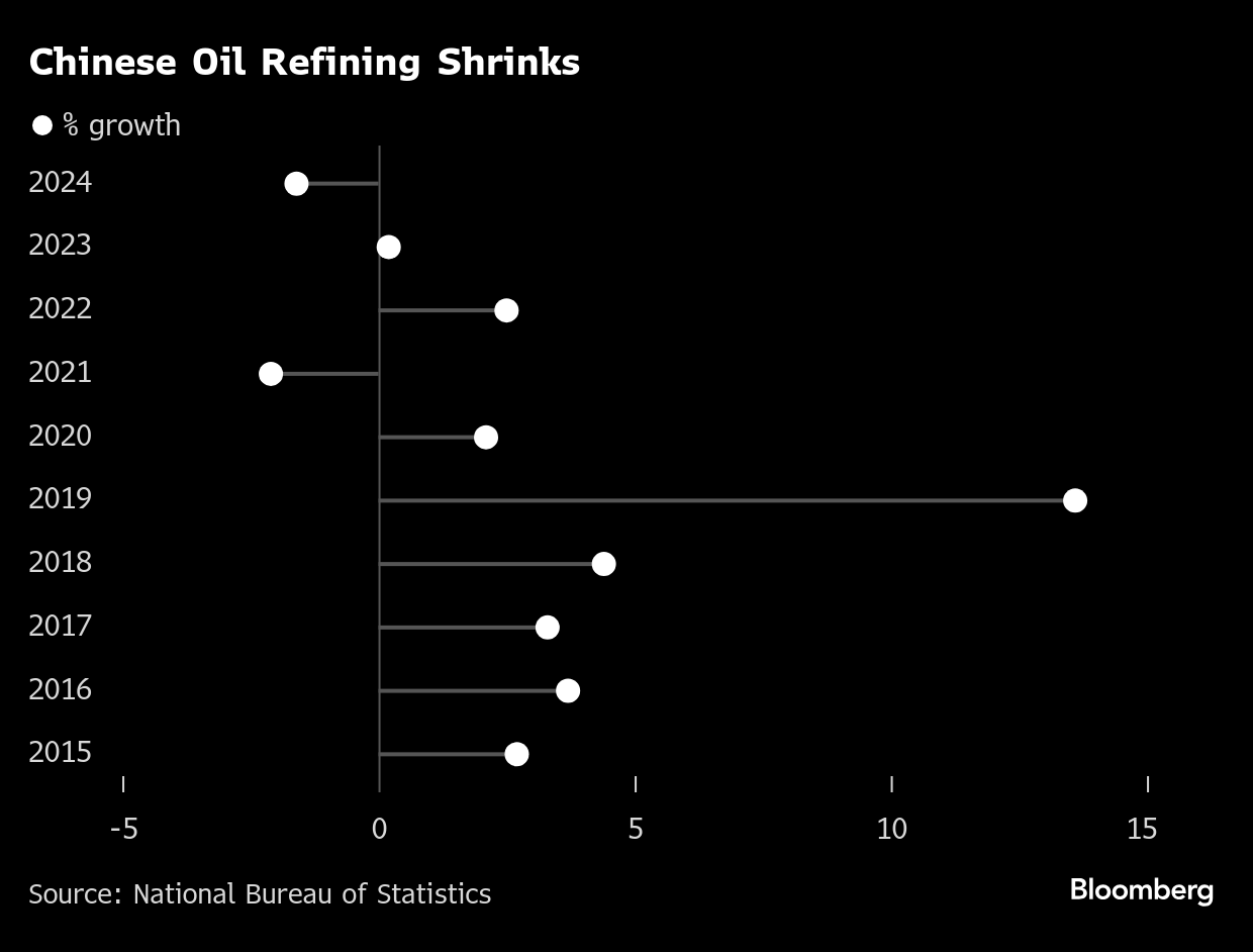 Oil processing, however, is an industry in decline as the Chinese economy slows and gets greener, cutting demand for fuels like gasoline and diesel. Refiners saw output fall 1.6% to 708 million tons.
