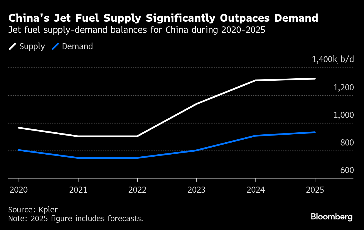(Bloomberg) -- China’s oil refiners are grappling with an oversupply of jet fuel, in yet another blow to the bottom line of a sector already dealing with ebbing demand for gasoline and diesel.