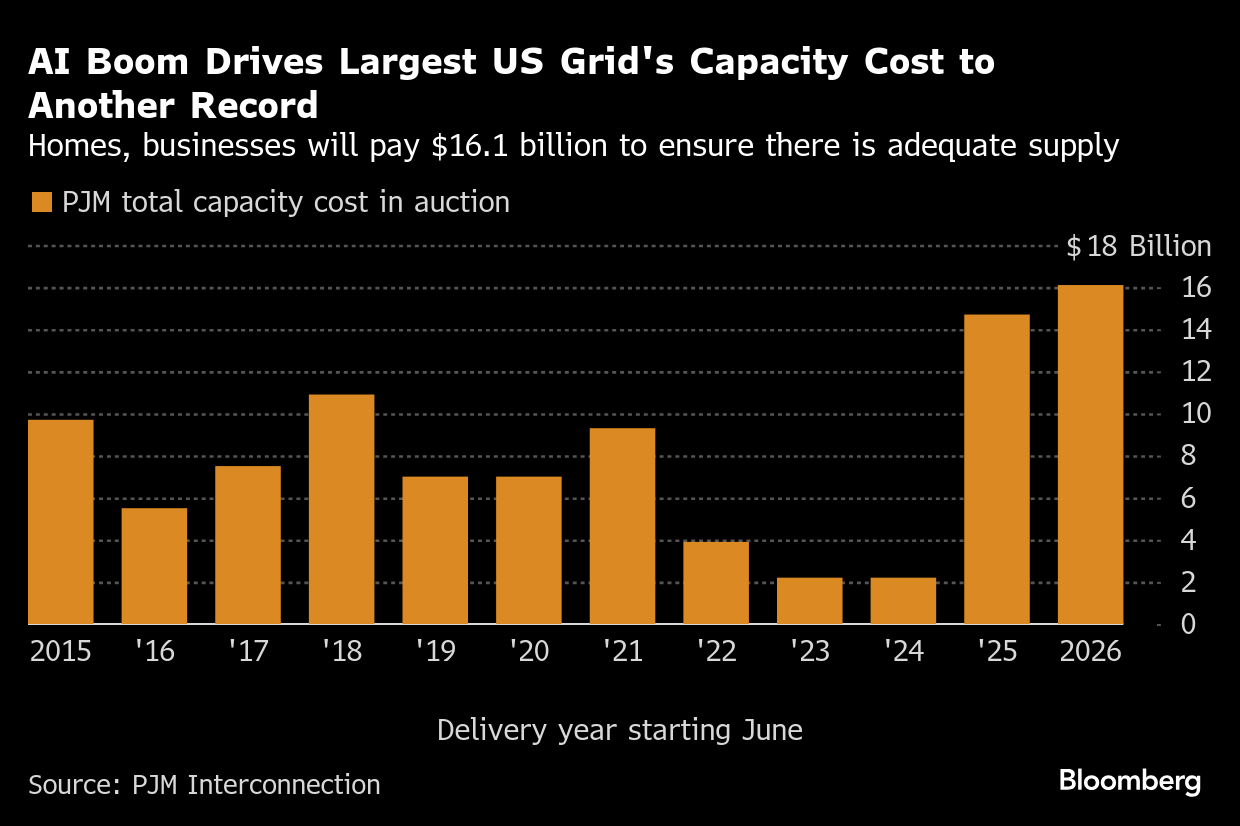 (Bloomberg) -- Businesses and households served by the largest US power grid will spend a record $16.1 billion to ensure electricity supplies amid a massive artificial intelligence-driven demand surge.