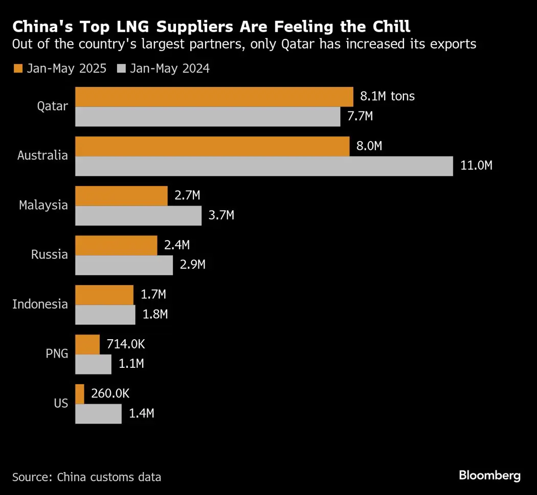 The other catch for the LNG trade is that China continues to diversify its energy purchases. That means changes in flows away from suppliers perceived to be less reliable — Chinese customs data show US purchases in the first five months of 2025 dropped more than 80% on the same period a year ago. Qatar ticked 5% higher.