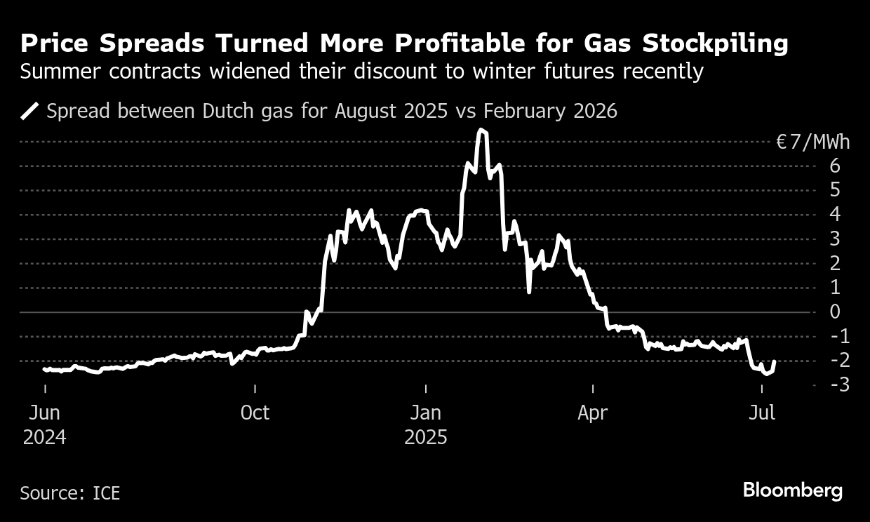 A key factor that has changed is that summer gas prices widened their discount to winter contracts during the recent market slump. Europe’s benchmark futures for August delivery traded about €2.5 a megawatt-hour lower than February 2026 contracts by the end of last week — the widest spread this year.