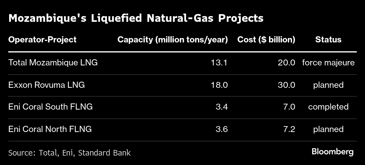 The raids by the insurgents — which have since prompted the deployment of troops by both Rwanda and, for a while, Mozambique’s neighbors to assist — drained momentum from the development of $50 billion worth of liquefied natural-gas projects, with Eni SpA and Exxon Mobil Corp. also developing plants.