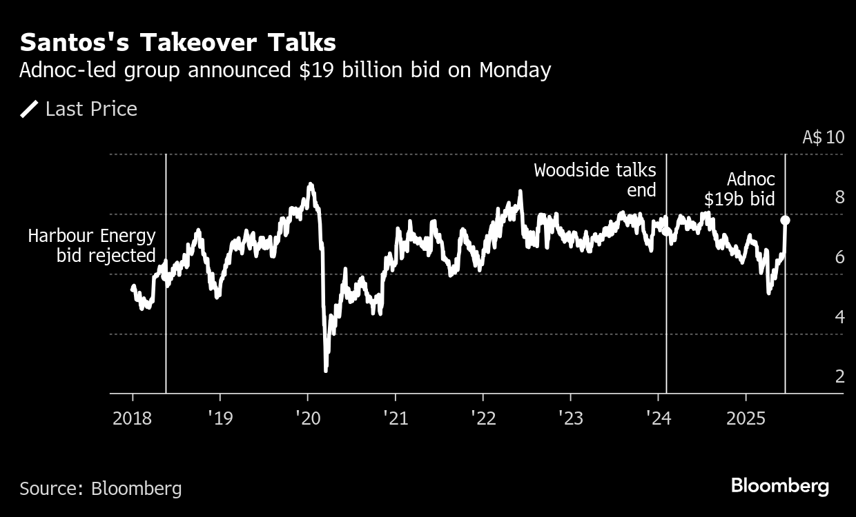 The consortium led by Adnoc’s investment arm XRG PJSC also includes Abu Dhabi Development Holding Co. and Carlyle Group Inc. It offered $5.76 (A$8.89) for each Santos share, a 28% premium to the closing price on Friday. The company’s board intends to unanimously recommend the bid to shareholders.