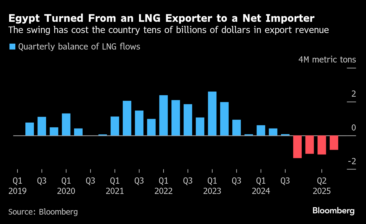 The move adds to import accords earlier this year and is aimed at cutting Egypt’s reliance on volatile spot markets. It’s a sharp turnaround for a country that until a year ago was exporting LNG. Declining gas output from domestic fields at a time of rising local demand has made Egypt a major importer and helped tighten global markets.