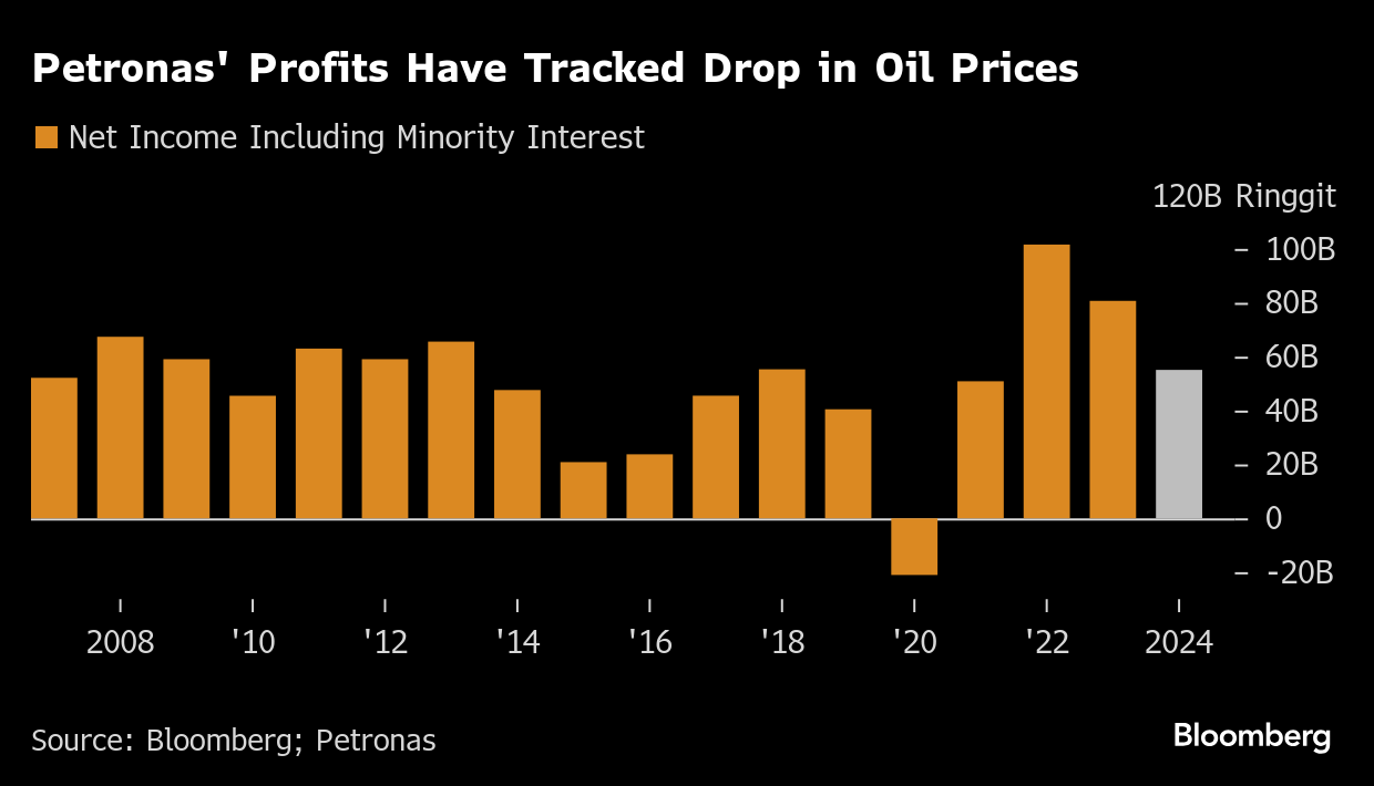 The oil price slump — coupled with declining output from its older assets — will pose a challenge for Malaysia’s government, which derived 10% of its revenue from Petroliam Nasional Bhd., the full name of the company, in 2024. Petronas not only anchors the nation’s energy sector, but also plays a key role in funding infrastructure, education, and social programs through dividends and taxes.