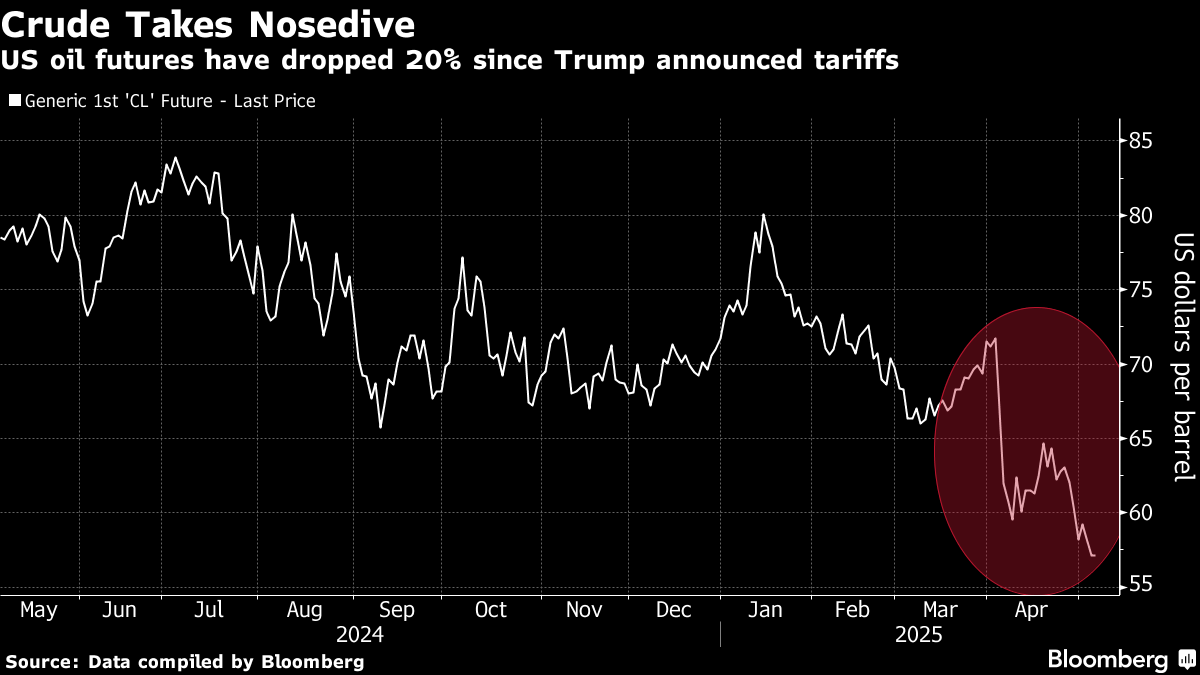 Crude prices have dropped about 20% since the start of April when Trump announced wide-ranging tariffs that triggered a global trade war. At the same time, OPEC and its allies have surprised markets with plans to increase oil supplies more than expected later this year.