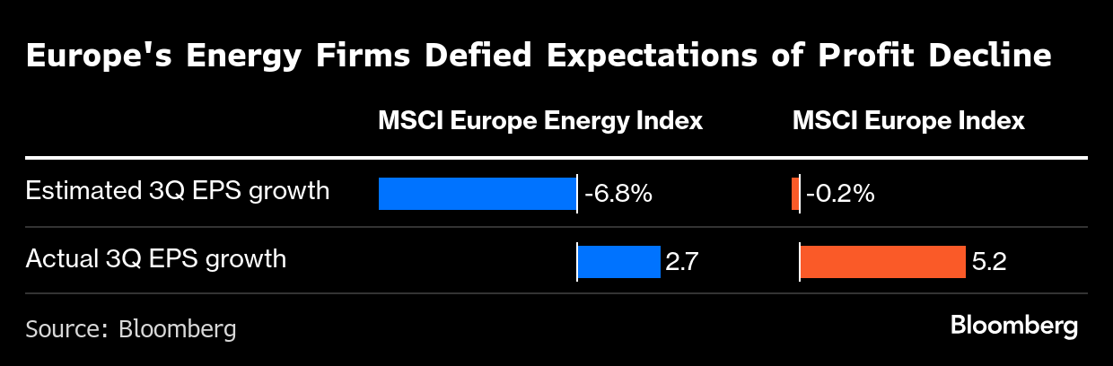 The MSCI Europe Energy Index delivered earnings-per-share growth of 2.7% for the third quarter, compared with expectations of a 6.8% decline, Bloomberg Intelligence data shows. Oil and gas companies also delivered the highest percentage of earnings beats in the period.