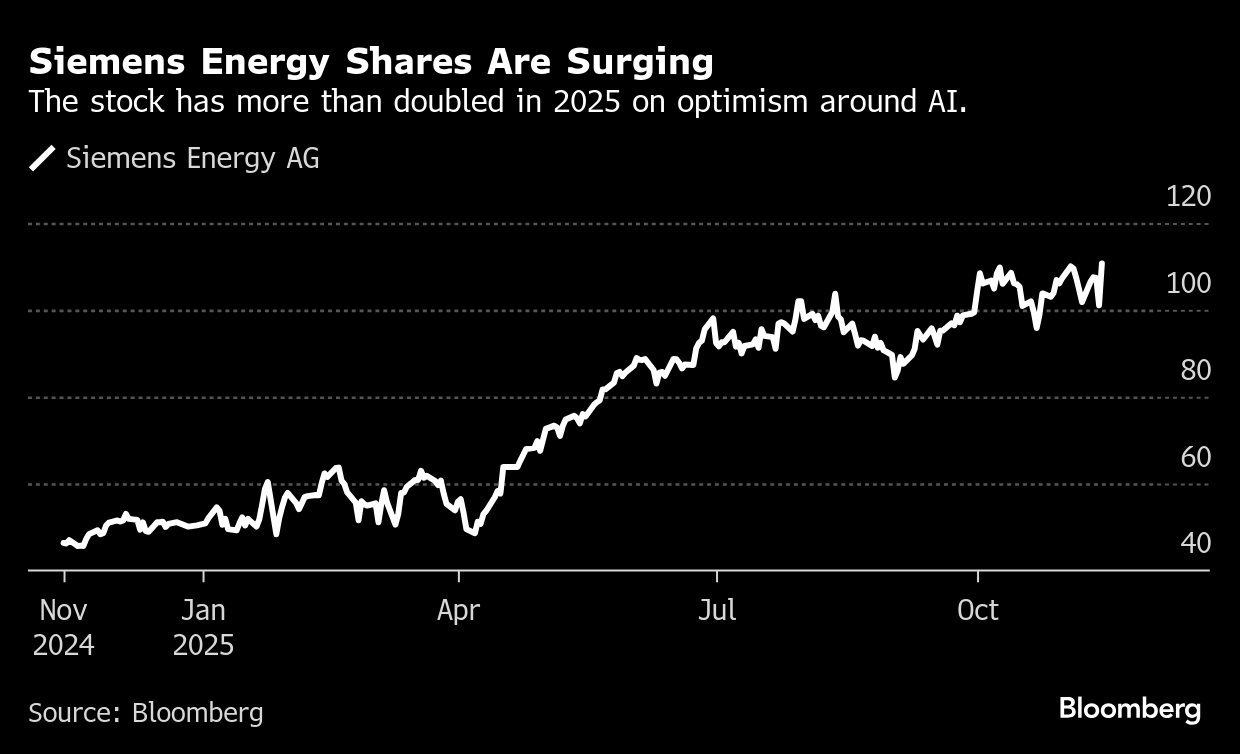 The company’s shares jumped as much as 12% in Frankfurt, the steepest intraday gain since April. While the stock has more than doubled this year on optimism around AI, Siemens Energy is still struggling to turn around its unprofitable Gamesa wind-turbine unit.